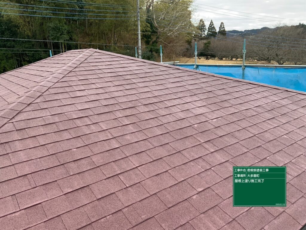 アスファルトシングル材の屋根で、吹き付けしてある小さな石がポロポロ落ちてくるのが気にされていたので、アスファルトシングル用の下塗り材を使いガッチリ固め耐久性のある仕上げにしました。