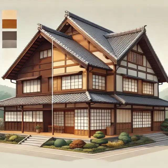 最後に、木材を使用した外壁には、ウォームブラウンやダークブラウンなどの自然な色合いがよく合います。木材は和風建築の基本的な要素であり、これらの色は、周囲の自然環境と調和しつつ、建物に温かみを与えてくれます。