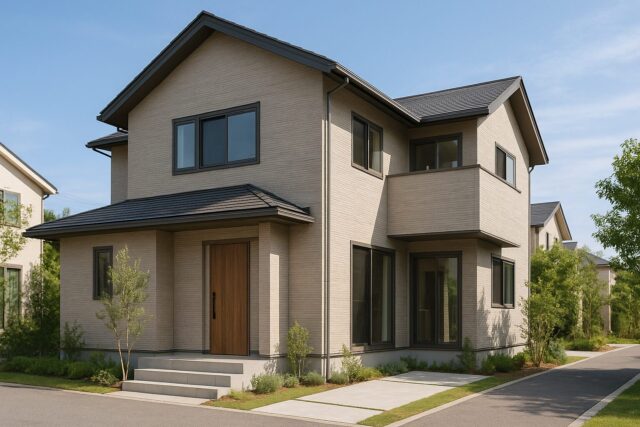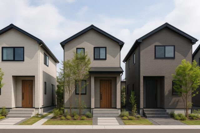 白・ベージュ・ブラウン系の住宅が多い地域でも、グレージュは「浮かない」「なじみやすい」色合いです。特に新興住宅地では似たようなデザインの家が並ぶことが多いため、グレージュを選ぶことで“個性を出しながらも違和感なく馴染む”効果があります。 -