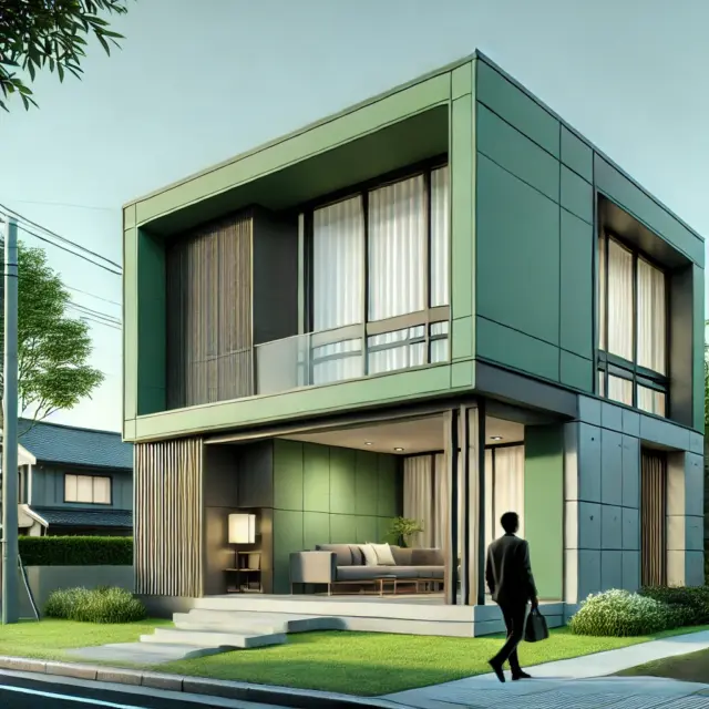 • デザイン: グリーングレーを基調とし、ホワイトの窓枠とドアでアクセントを加えたシンプルなデザイン。