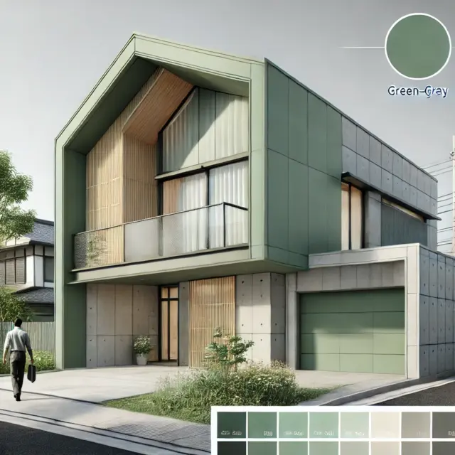 • グリーングレーは他の色との組み合わせが重要です。白やベージュ、木材のような自然素材をアクセントとして使用することで、外観全体のバランスが取れます。
