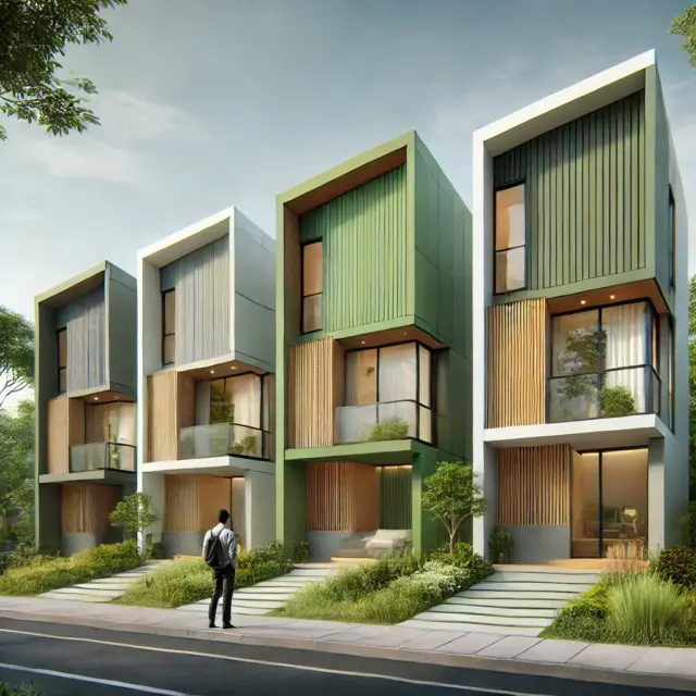 • デザイン: グリーングレーをベースに、ホワイトの窓枠やドアをアクセントにしたモダンな外観。