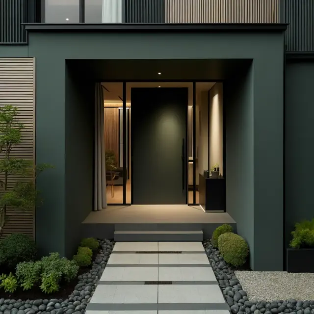 - 植栽との組み合わせ:ダークグリーンは植物の緑との相性が抜群です。玄関周りや庭に植物を配置することで、自然の中に溶け込むような雰囲気を作り出せます。特に、明るい緑色の低木や白い花の植栽を取り入れると、ダークグリーン外壁がより映えます。