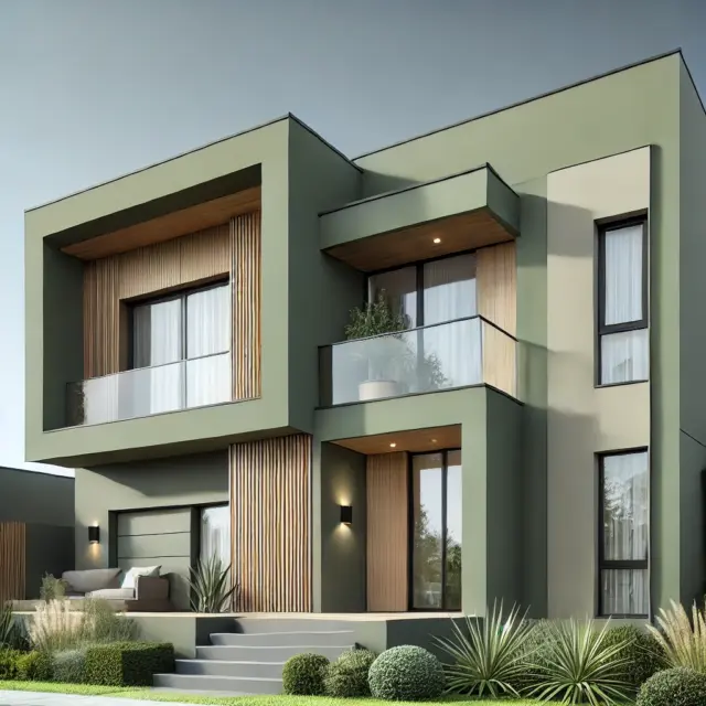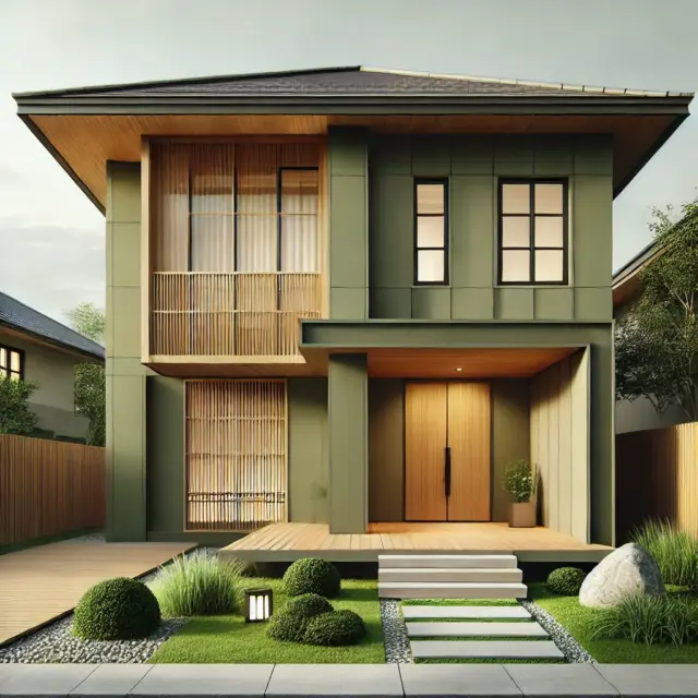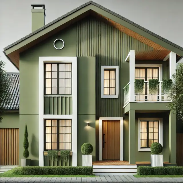 ポイント: 窓枠やドアの色、植栽、質感などを工夫することで、オリーブグリーンの外壁がさらに引き立ち、おしゃれな印象を与えます。