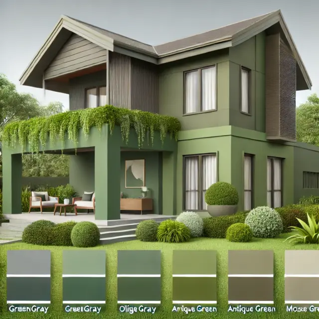 2. グレー系: グレーはオリーブグリーンと相性が良く、落ち着いた印象を演出します。外壁の一部にグレーを使うことで、洗練された大人っぽい雰囲気を出すことができます。