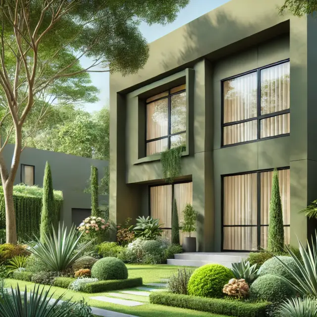 2. 植物を活かす: オリーブグリーンは自然と相性抜群なので、家の周りに植栽を施すことで、外壁の色が引き立ちます。特にシンプルなシルエットの植木や花壇を設けると、ナチュラルで上品な印象になります。