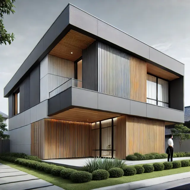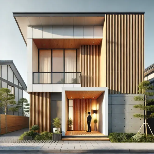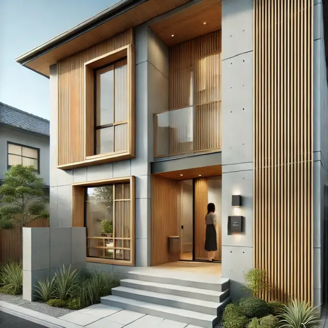 • ポイント:色の組み合わせは、建物のデザイン全体に大きな影響を与えます。明るい色の木目調パネルを使用する場合は、周囲の外壁材をシンプルで落ち着いたトーンにすることで、木目の温かさと質感を引き立てることができます。逆に、濃い色の木目を使う際には、明るいトーンの外壁材と合わせることでバランスを取り、全体に統一感を持たせることがポイントです。