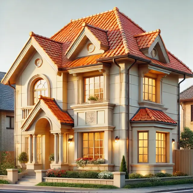 オレンジの屋根は、ヨーロッパ風のデザインと非常に相性が良いです。特に南フランスやイタリアを思わせる家にしたい場合、外壁にアイボリーや淡い黄色を取り入れると、温かく明るいヨーロッパ風の雰囲気を楽しむことができます。