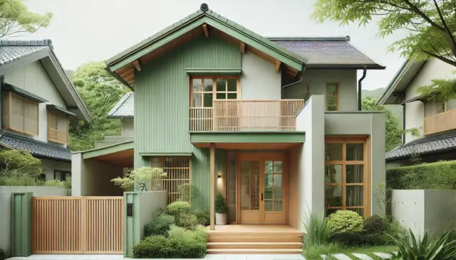 この色は、自然界の緑を連想させ、木々や植物のある庭との相性も抜群です。アンティークグリーンは、ツートンデザインで使うと家全体に落ち着きと自然な温かみを演出します。
