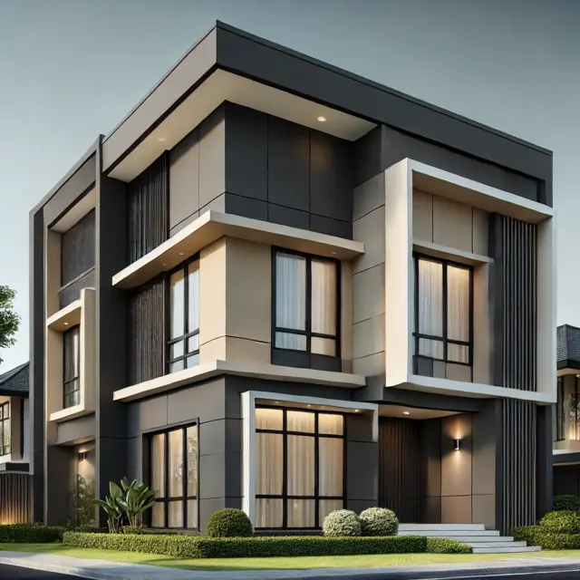 ダークグレーと黒を組み合わせると、非常にシンプルで力強いモダンデザインになります。特に、屋根や外構に黒を使うことで統一感が生まれます。ただし、全体が暗くなりすぎないよう、窓枠に明るい色を加えると良いでしょう。