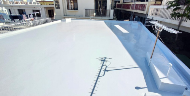 ウレタン防水は、液体のウレタン樹脂を塗り重ねることで防水層を作ります。柔軟で施工しやすいため、凹凸が多い屋上や複雑な形状の場所にも適しています。ただし、5〜8年ごとにトップコートを塗り直す必要があり、紫外線による劣化を防ぐためのメンテナンスが必須です​。